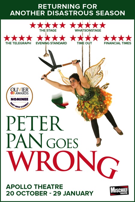 Mischief Theatre’s Peter Pan Goes Wrong returns to the West End for a second limited season. Once again, the members of the Cornley Polytechnic Drama Society battle against technical hitches, flying mishaps and cast disputes. Will they ever make it to Neverland? For the slickest show in the West End, DON’T see Peter Pan Goes Wrong!
